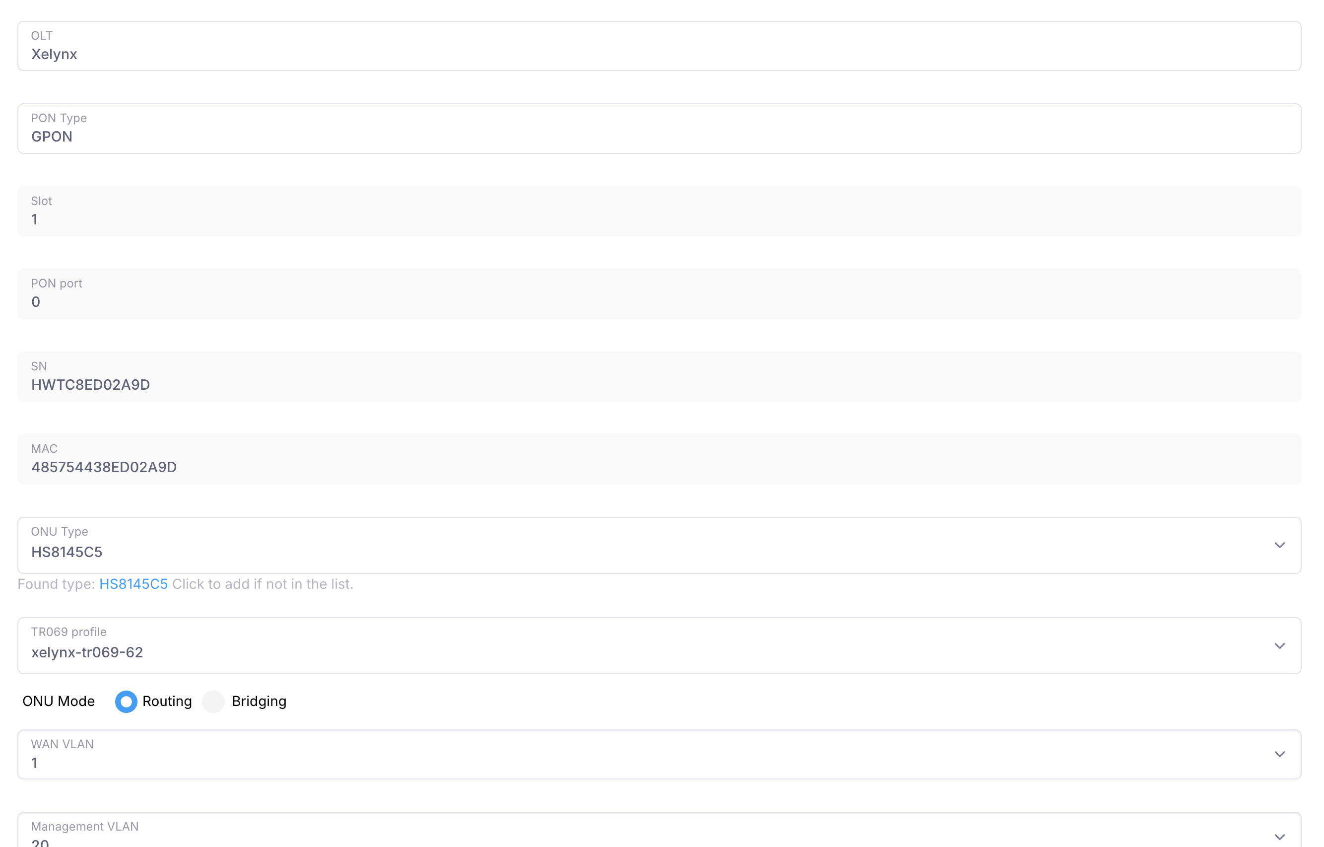 Most of the details are filled automatically. You need to have set a VLAN as management VLAN from OLT settings to add ONU. ONY type is automatically matched if found, else its set to Generic.