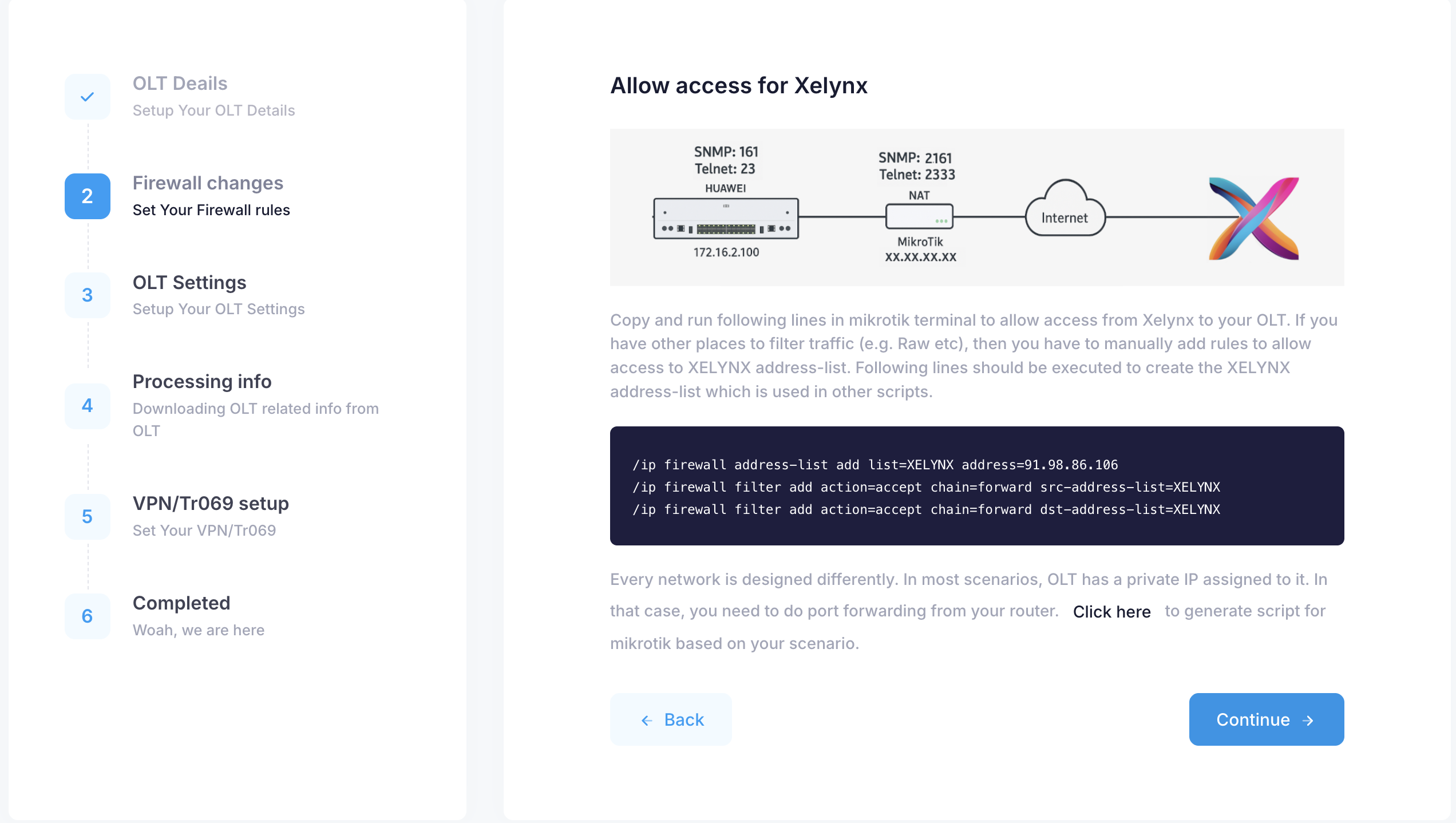 In this step, you are asked to allow access between Xelynx and your OLT.