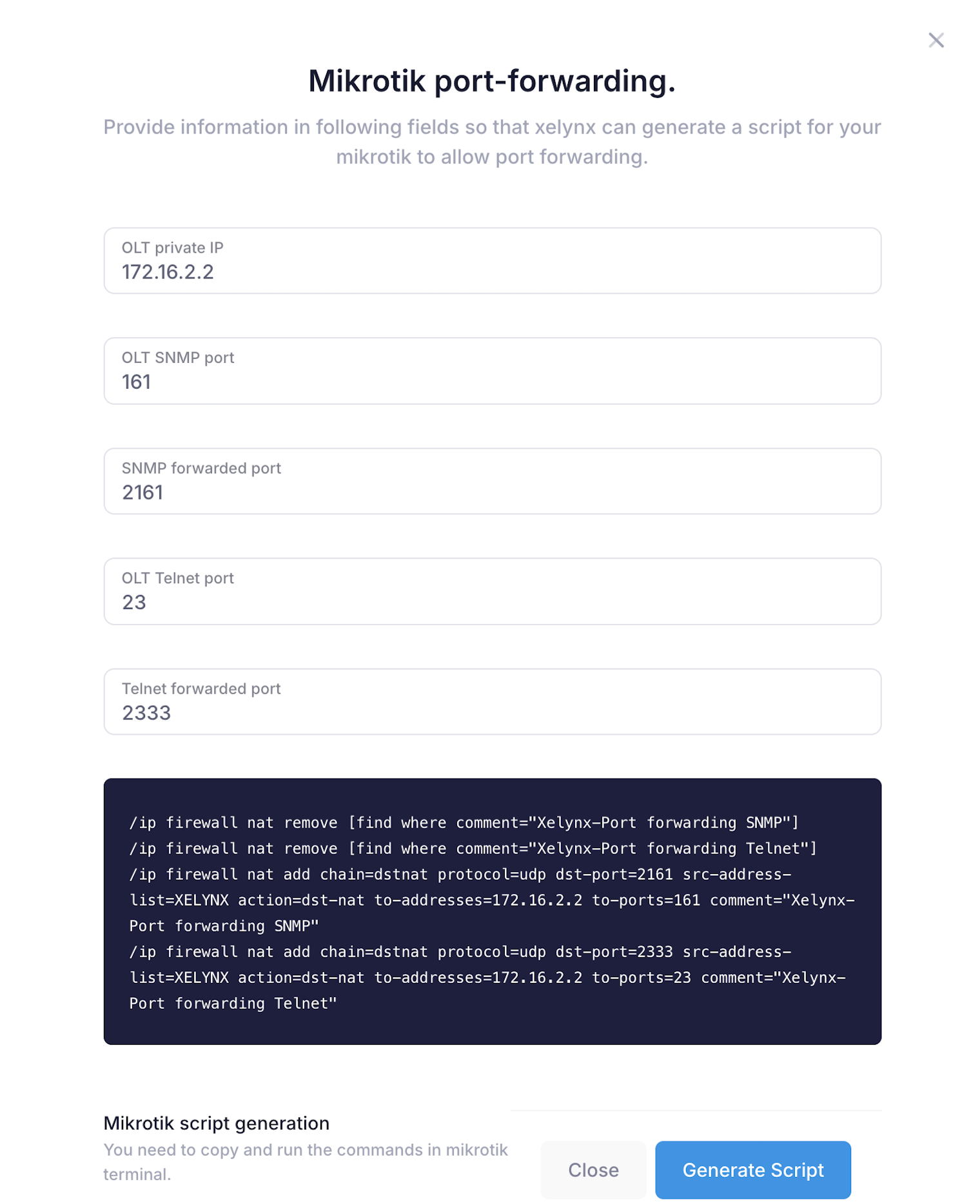 Firewall rules We provide a script for Mikrotik and you just need to run these commands in Mikrotik terminal to allow acess. In case you have a different router, make sure you allow access between your OLT and Xelynx.