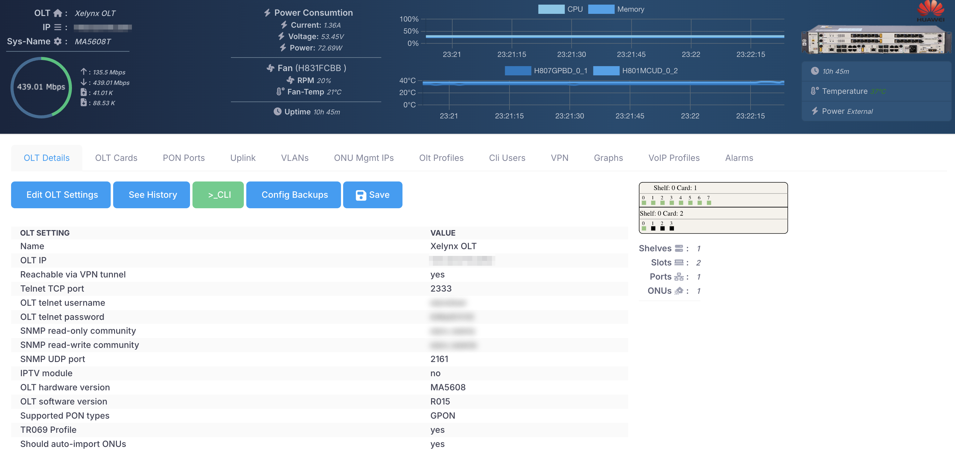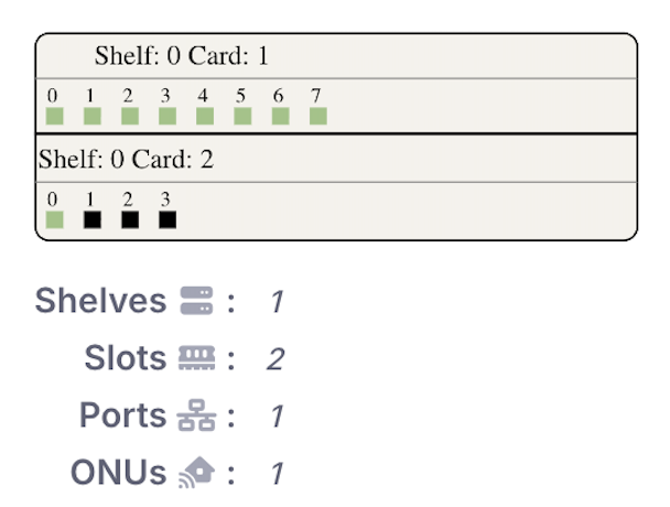 PON ports: This displays number of pon ports in each card and their status. Uplink Ports: This display number of uplink ports and their status. Other: This display total shelves, slots, ports and ONUs on the OLT. |