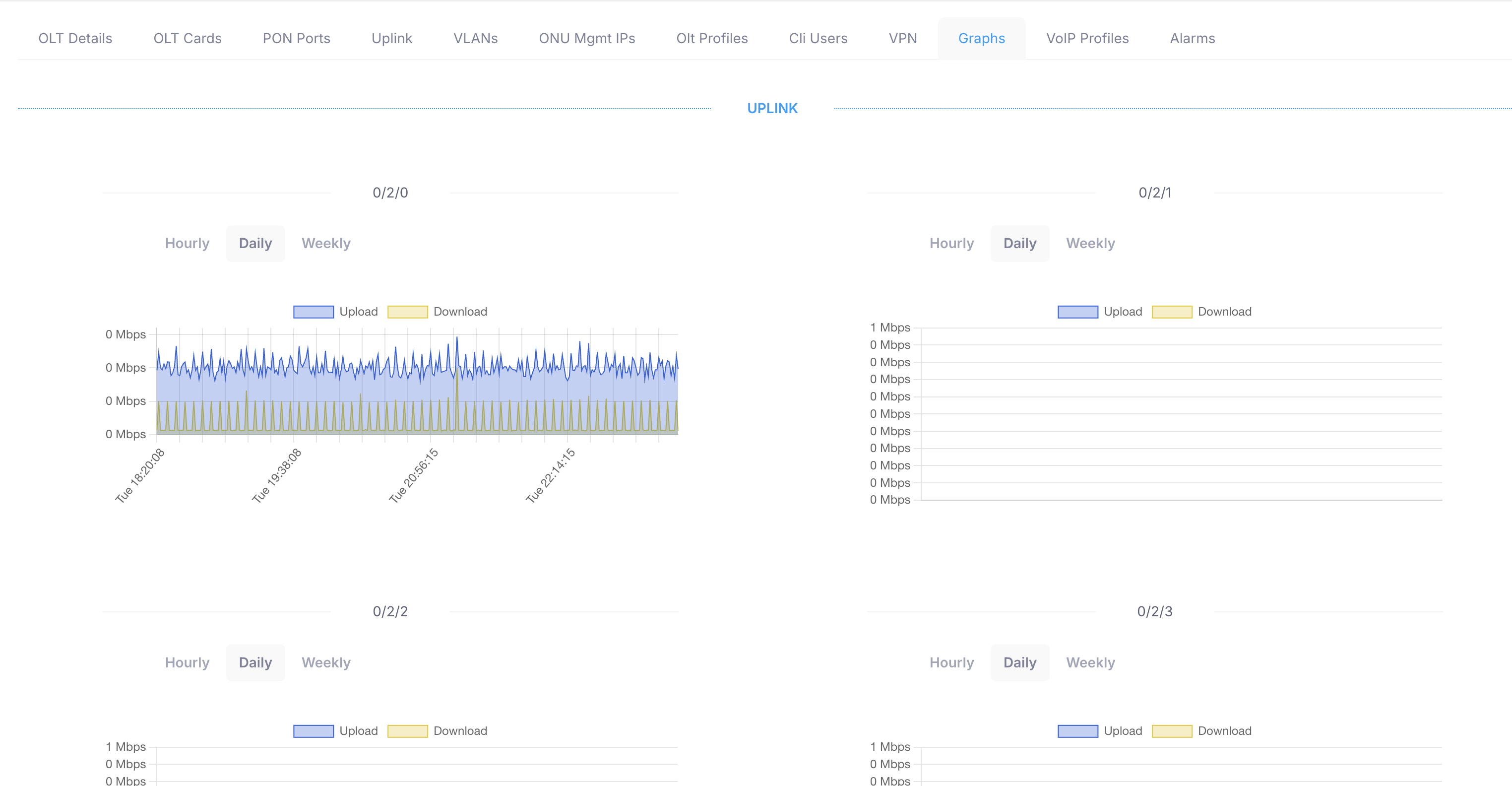 This dsplays bandwidth utilization graphs of all uplin k and PON ports. You can see it in hourly, daily or weekly level.
