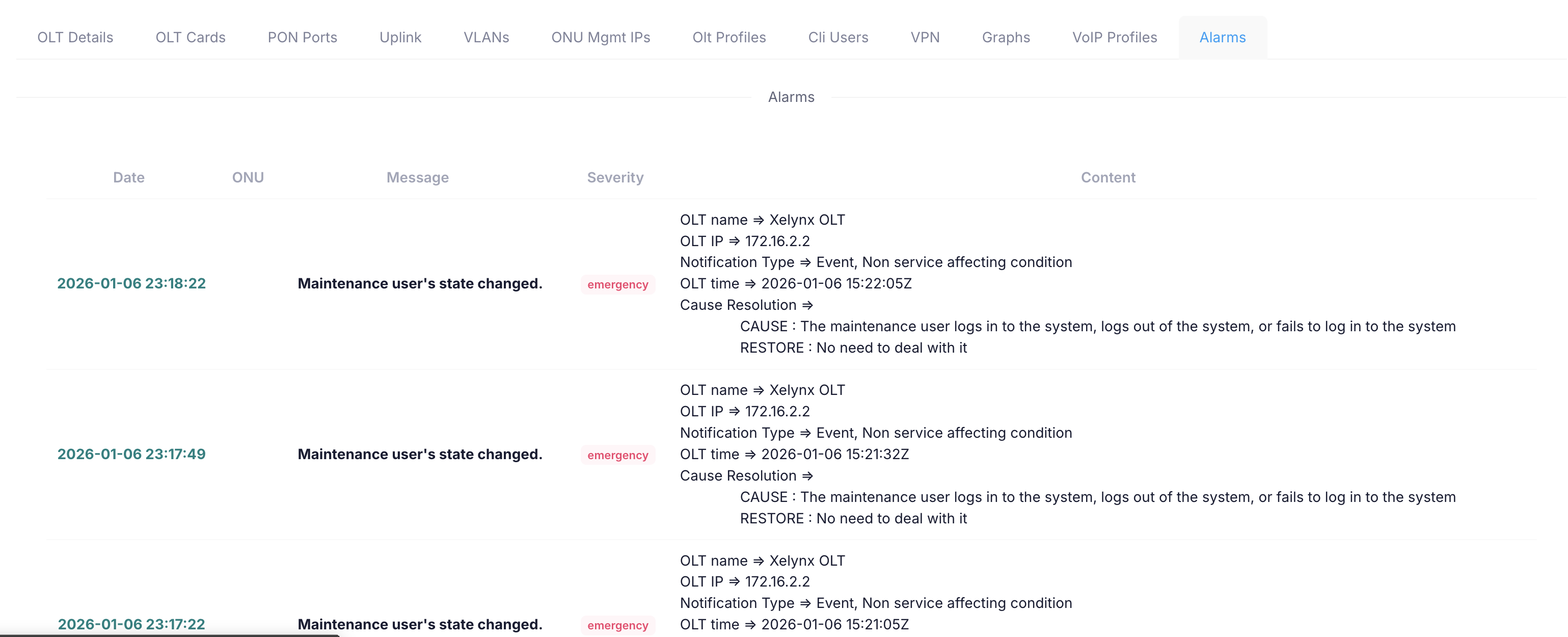 This tab displays all the alarms generated on the OLT. It shows their alarm level and description and detail of each alarm.