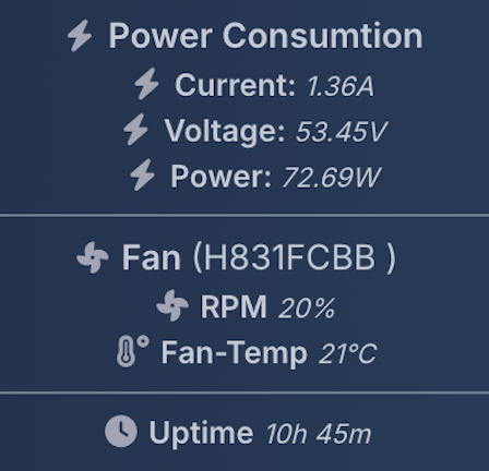 Power consumption: This displays current, voltage and power consumption of OLT. In case an external power supply is used then it displays that. Fan status: This display Fan stats like RPM and temperature. Up-time: This display up time of the OLT. |