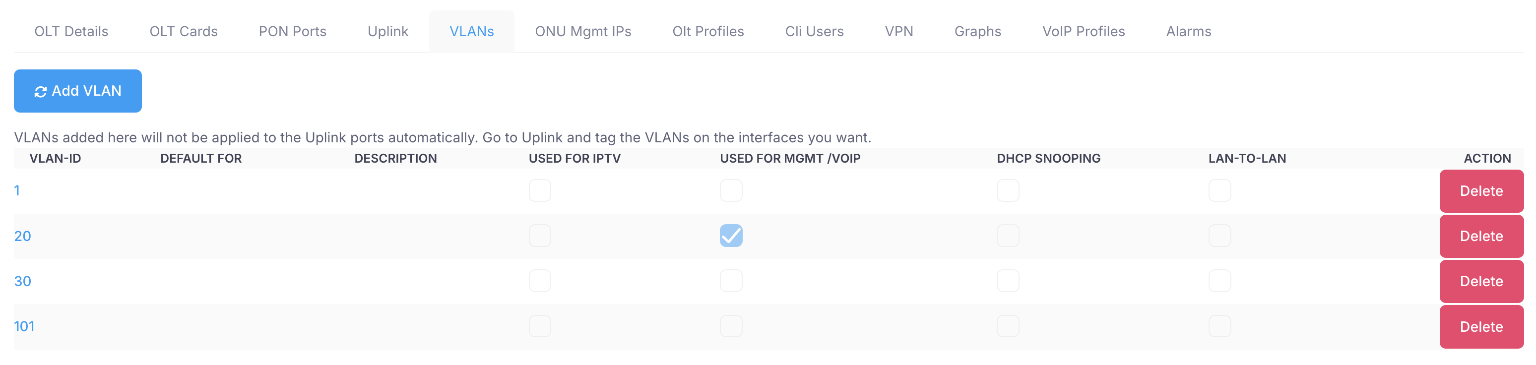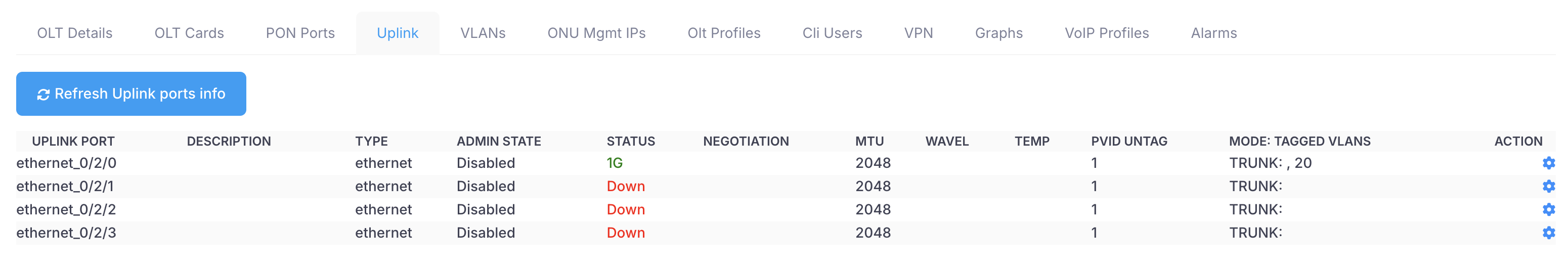 On this tab Xelynx gives list of all uplink ports on your OLT. You can tag and un-tag VLANs from uplink ports from here.