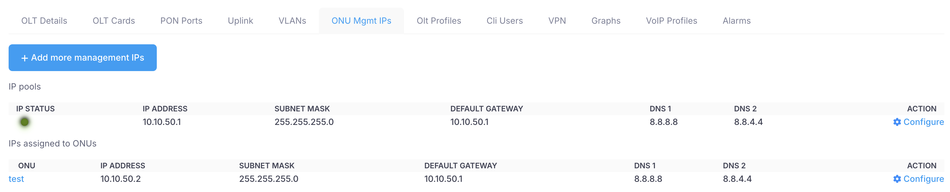 On this tab you can add/modify IP pools to be used for Management of ONU devices. It displays you if IP pools are reachable and also list all ONUs with corresponding Management IPs.