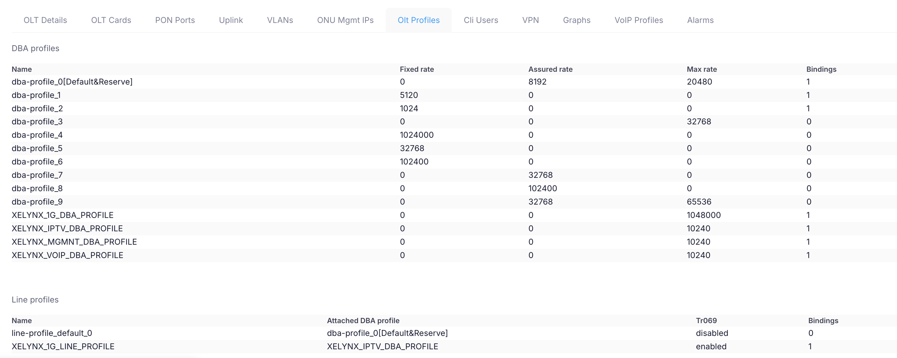 On this tab Xelynx lists all profiles i.e. DBA profiles, Line profiles, service profiles and speed profiles (Traffic tables).