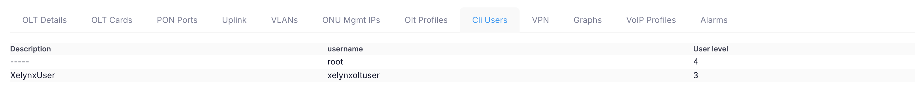 On this tab Xelynx list all CLI users on OLT and their level.