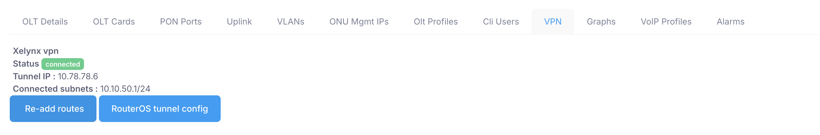 This dsplays VPN status and all the pools routed on this VPN (all management pools. It also gives you the script to re-add the VPN client on mikrotik router. Also, you can re-add routes on the server in case routes are not being routed on Xelynx server.