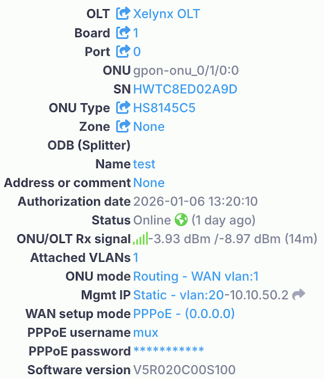 OLT: This tells you the OLT this ONU is connected to. You can click on it and move the ONU to a different OLT. By clicking on the arrow icon, you will get a list of all ONUs on that OLT. Board: This tells you the OLT board this ONU is connected to. You can click on it and move the ONU to a different Board of the OLT. By clicking on the arrow icon, you will get a list of all ONUs on that Board. Port: This tells you the OLT PON port this ONU is connected to. You can click on it and move the ONU to a different PON port of the OLT. By clicking on the arrow icon, you will get a list of all ONUs on that PON port. ONU: This tells you the complete ONU path on OLT i.e. Shelf, Board, Pon port and ONU number and ONU type. SN: This tells you the SN of the ONU. ONU Type: This tells you the ONU model/Type. You can change the model/type by clicking on the value and selecting a new value. Zone: This tells you the Zone on Map ONU falls in. You can also select the ODB from here. You should create a zone using Maps page. You can get/set the geo location of the ONU from here as well. You can change the name of ONU from here as well. Name: This tells you the Zone on Map ONU falls in. You can also select the ODB from here. You should create a zone using Maps page. You can get/set the geo location of the ONU from here as well. You can change the name of ONU from here as well. Authorization Date: This tells you the date and time this ONU was authorized on Xelynx. Status: This tells you the current live status of the ONU. It tells you the reason if the ONU is offline. This gives you live status of the device. ONU mode: You can change the operatin mode, WAN VLAN, and WAN side IP configuration by clicking on it. Some of the features work if Tr069 is working. WAN setup mode: You can change the operatin mode, WAN VLAN, and WAN side IP configuration by clicking on it. Some of the features work if Tr069 is working. Mgmnt IP: You can select a Tr069 profile and give ONUs management side IP configuration and Management VLAN. Software version: This tells the software version of ONU. |