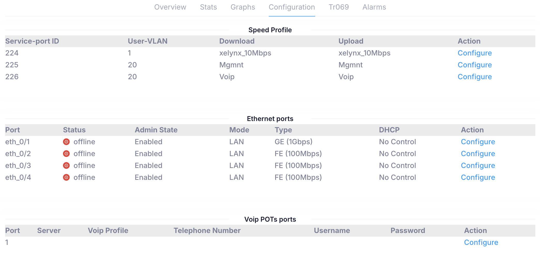 On this tab you can configure service ports VLANS, speed profiles, Ethernet ports on ONUs's access modes and VoIP pots settings.