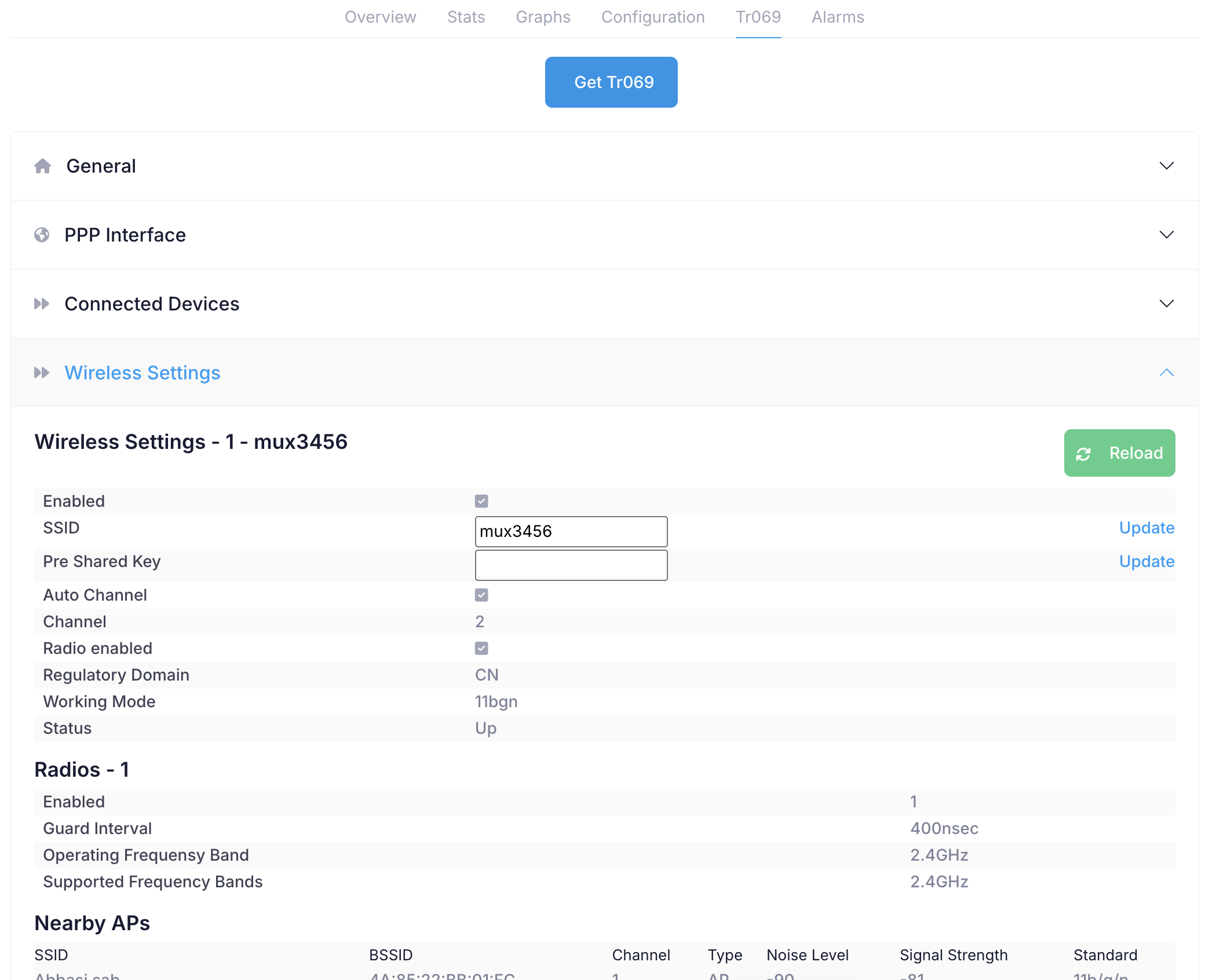 On this tab you can get all ONUs details from Tr069. You can get and set various values, see list of connected devices on LAN or WiFi of ONU, nearby APs, signal strengths and logs etc.