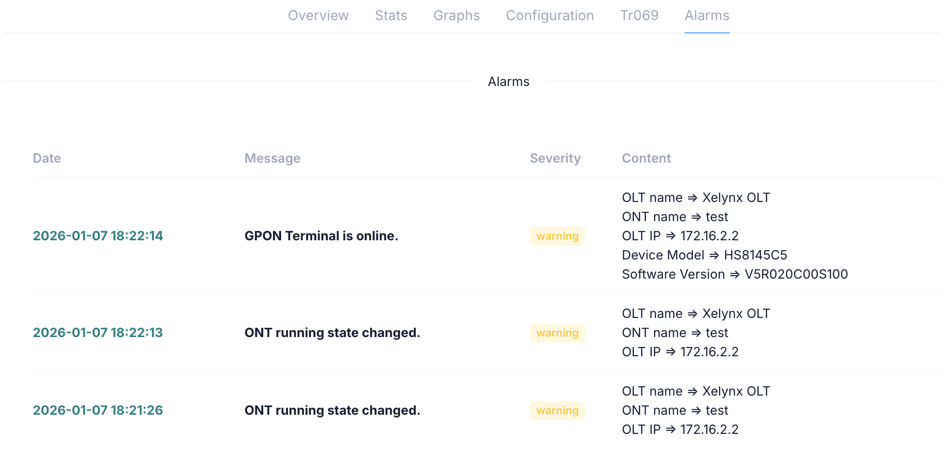 Xelynx shows all the alarms raised on OLT for this ONU.