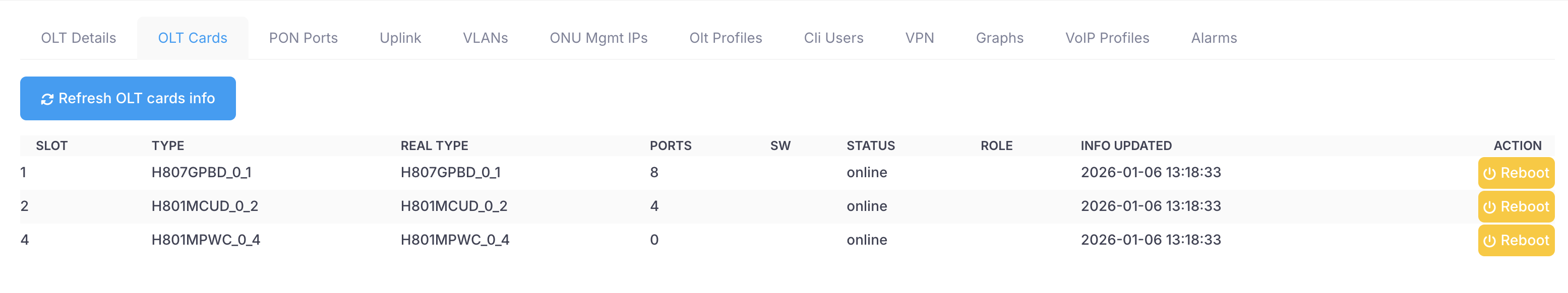 On this tab Xelynx gives list of all cards on your OLT. It gives you details about their status, Model and number of ports if any. You can also reboot cards from here.
