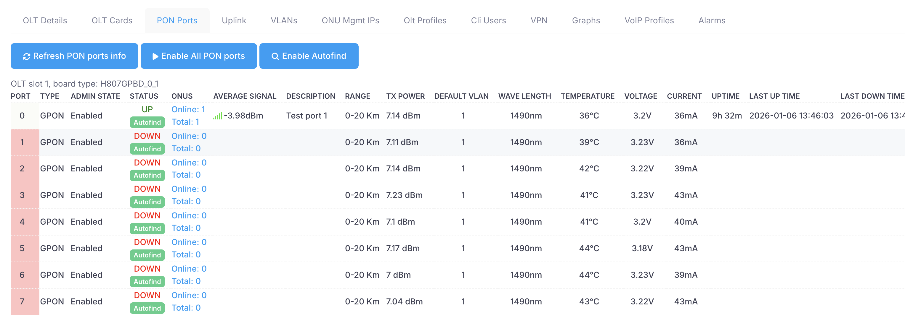 On this tab Xelynx gives list of all PON ports on your OLT. It gives you details about every single detail about the port (27 different fields). You can also enable autofind on PON ports from here.